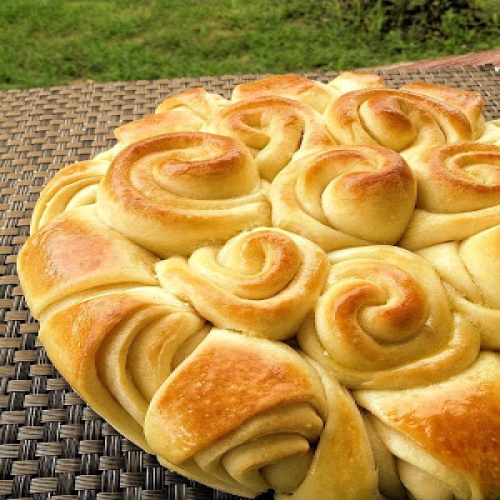 7. Preheat oven to 180C. Grease or line a large baking tray. In the middle of the tray, arrange the cut ends of the rolls around each other to form a circle, placing the cut sides down. Arrange the cut triangles to completely surround the middle circle. Cover with towel and leave the dough to rise in a warm place for about 30-40 minutes.